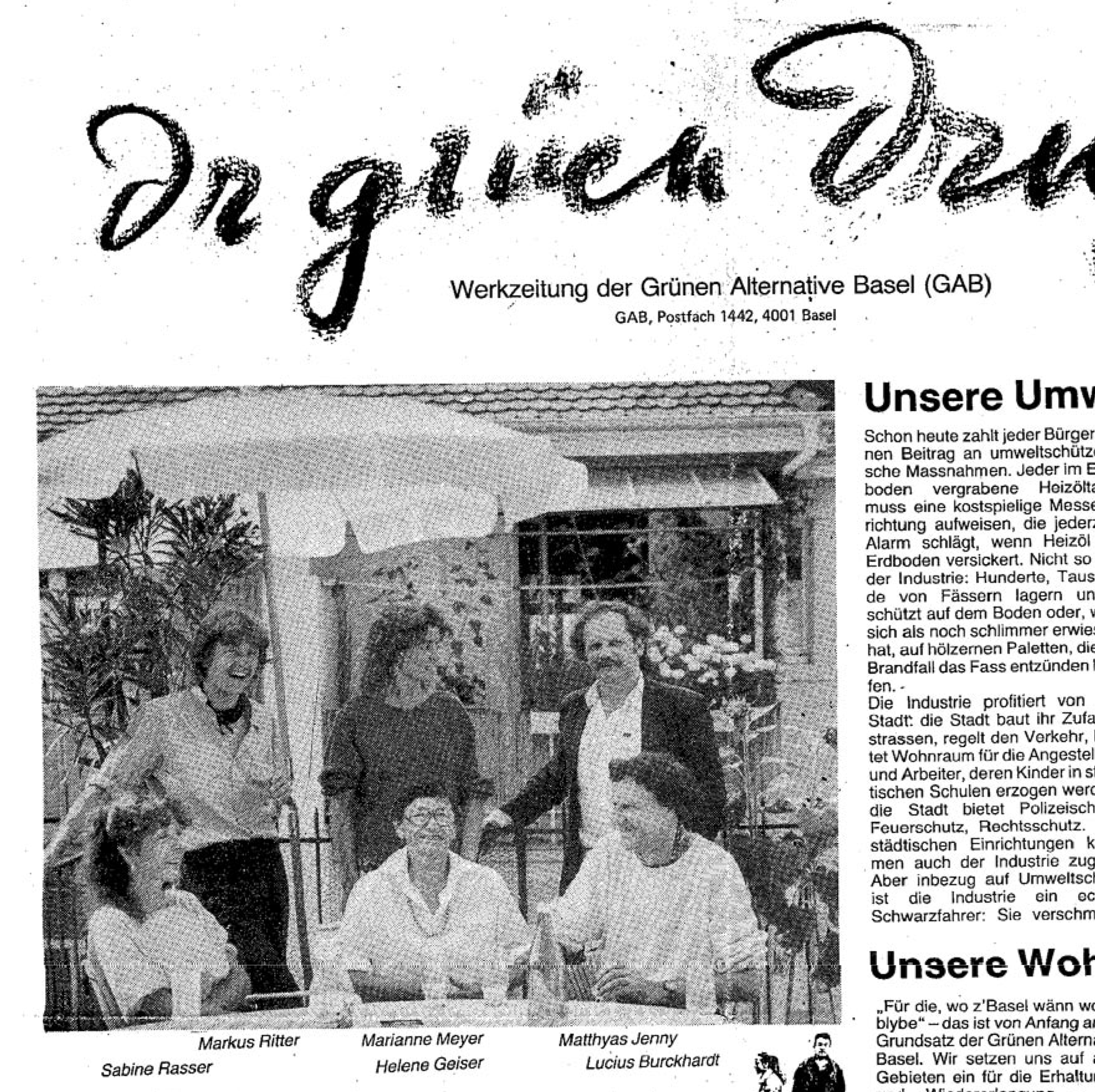Am 10. Oktober ist der Schriftsteller und Literaturaktivist Matthyas Jenny gestorben. Matthyas war unter anderem bekannt als Gründer des Literaturfestivals in Basel. Hingegen ist heute nur wenigen in Erinnerung, dass Matthyas 1987 zusammen mit Markus Ritter, Marianne Meyer, Sabine Rasser, Helene Geiser und Lucius Burckhardt (siehe Bild) auf der Liste der «Grünen Alternative Basel» (GAB) für den Nationalrat kandidierte. Es war damals das erste Mal, dass sich die GRÜNEN an den Nationalratswahlen beteiligten. Die Parole «Für die, wo z’Basel wänn wohne blybe» war eine Anspielung auf die Katastrophen von Seveso und Schweizerhalle.
